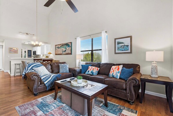 Designed for comfort and connection, The Joyful Getaway will feel like your home away from home. Imagine waking up to the aroma of freshly brewed coffee—whether you prefer drip or Keurig—and sipping it at the sleek kitchen counter, framed by gleaming stainless steel appliances and expansive white countertops that make cooking a pleasure. Glide into the dining area, where a table for six invites you to gather for laughter-filled meals and late-night games. In the cozy living room, sink into the plush couch or loveseat as you stream your favorite shows on the smart TV, or slide open the balcony doors and let the Ozark breeze sweep in. Outside, a table for four awaits—perfect for enjoying your morning coffee, a sunset dinner, or simply soaking in the peaceful resort vibes.