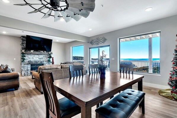 Timber Ridge offers a spacious 7-bedroom retreat with stunning Table Rock Lake views. Enjoy a seasonal pool, hot tub, fire pit, playground, and water park. Share meals at the large dining table and enjoy the lake scenery from the back deck.