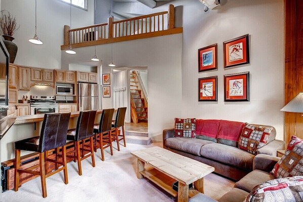 Open kitchen and living room spaces provide ample room for the whole party. The condo is fully stocked with necessary cooking and dining utensils and linens. The laundry facilities are in the garage and are coin operated.