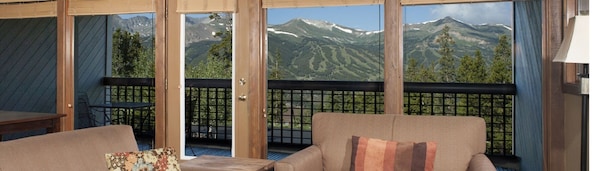 Our townhome features two queen beds, two twin beds, a queen sleeper sofa, full-size kitchen, separate dining room table, gas fireplace, private balcony, three full bathrooms, multiple TVs, in-unit washer/dryer and more.