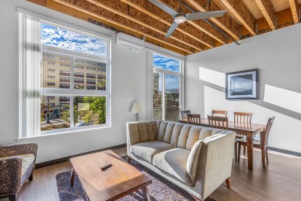 Beautiful high ceilings give the unit a spacious feel. Expansive windows overlooking Downtown Bremerton, Puget Sound Navy Museum and Pacific Avenue give you endless opportunities for people watching while you relax and let the bustle fade away while natural light streams in.