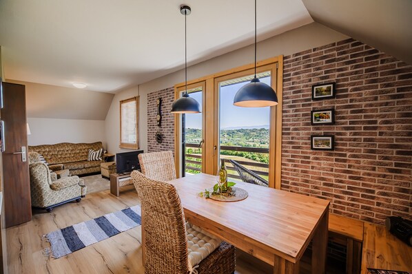 Perched on a hill in Orešje na Bizeljskem, Holiday Home offers panoramic views of the vineyards. Unwind with a BBQ on the terrace or relax in the cozy living room with WiFi and flat-screen TV.