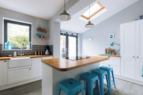 Flooded with natural light from the garden doors, enjoy this bright and beautiful kitchen area, fully equipped with modern appliances and Nespresso machine, everything you need to cook up a storm!