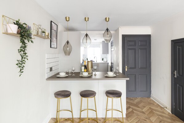 There are five double bedrooms spread across three floors, the first being on the ground floor and has an ensuite shower room the width of the room, two further bedrooms on the first floor which also each have an en-suite shower room and the top floor which is home to the last two bedrooms and a spacious family bathroom with a bath tub in place and shower above the bath. Each bedroom is furnished with a brand new double bed and mattress, desk, chair, bedside table, chest of drawers, drawers, 32 inch TV mounted to the walls and wardrobe or hanging space. They are finished tastefully with a feature wall each, faux plants, new curtains (black out blinds in the top bedroom) and bedside lamps.