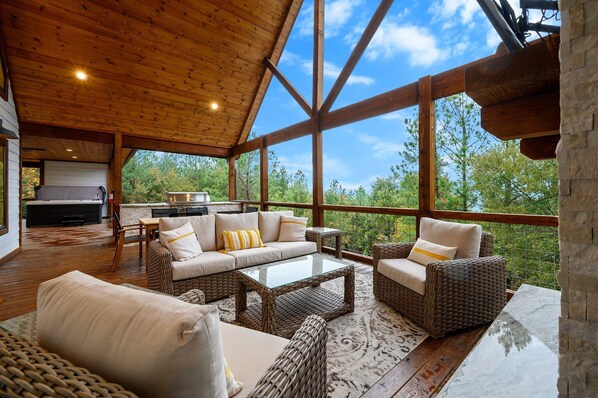- Fireplace and TV on the deck: Cozy up outdoors, rain or shine.