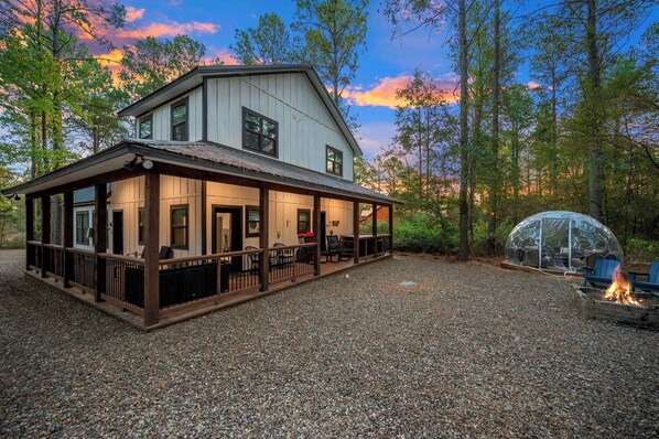 Escape to White Tail Retreat, a luxurious cabin nestled among mature trees. This family-friendly retreat offers a private hot tub on the covered deck, outdoor games and playset for kids, and an electric vehicle charger for your convenience. The spacious living area features a chef's kitchen with professional-grade appliances and a luxurious coffee station.