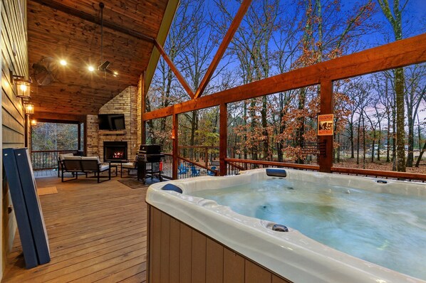 Enjoy the great outdoors from the expansive, walk-around covered deck. Start your mornings with a cup of coffee in a rocking chair, relax in the large private hot tub, or cozy up around the outdoor fireplace with a glass of wine.