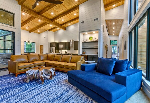 Inside, two elegant king suites provide a private oasis, each with a plush bed, Smart HDTV, and ensuite bath. The bunk room is a kid-friendly haven, featuring queen-over-queen and twin-over-twin bunks, plus its own full bathroom. The open-concept living area is designed for gathering, with a cozy sectional, a gas fireplace, and large windows that bring in natural light. The fully equipped kitchen makes mealtime a breeze with a gas stove, wine fridge, coffee bar, and seating for the whole group. Whether you're enjoying a leisurely breakfast or preparing a family feast, this thoughtfully designed space has everything you need for a seamless stay.