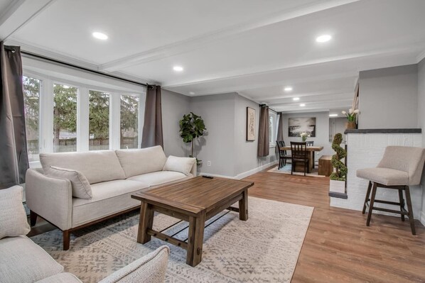 Stay entertained with the Smart TV by logging into your favorite apps. If you can't agree on what to watch, there's a second lounge with a large sofa and another flat-screen TV, allowing your group to spread out comfortably. This home is also family-friendly, ensuring a great stay for guests of all ages. 🍽️ 🍷📺