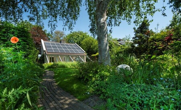 The holiday home is equipped for 4 people and is mainly decorated with vintage design-furniture. The living room with dining area offers views over the flowery garden. The attic space is in open connection with the living room and is accessible by an open staircase. This sleeping area contains a comfortable wooden double bed. The other bedroom is located on the ground, can host two people and has access to the sunny garden. The small but charming kitchen is equipped with all essentials. The bathroom (incl.toilet) is basic.