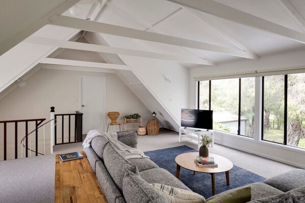Climb the spiral staircase to enter the upstairs loft area which has been set-up for your recreation with a huge sofa, TV and a foosball table.