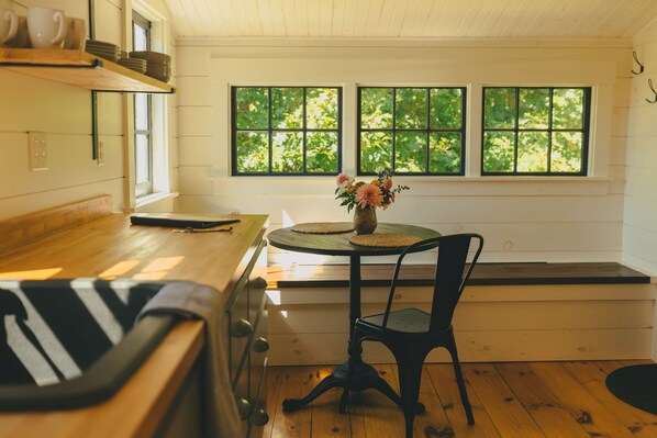 HIGHLIGHTS INCLUDE • A sun-speckled dining nook, perfect for slow mornings with coffee • Fresh country air and quiet walks right from your doorstep • A cozy living space with books, blankets, and room to unwind • Starlit evenings by the fire pit or quiet nights in with a home-cooked meal • Reliable Wi-Fi and a comfortable workspace for remote work This is a peaceful, adults-only retreat meant for rest, creativity, and connection with nature.
