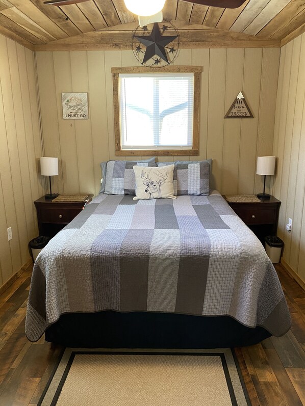 This small cabin with one full bathroom (washer/Dryer)(Shampoo and body wash) and one bedroom (Queen Bed). The cabin offers a open floor plan and has two twin beds. I also have two twin air mattress if needed. This small cabin can sleep six. ALL LINENS ARE PROVIDED. The kitchen is a fully stocked with everything you would need. Dinning room table with four chairs and if you need more room. There is a bar with four bar stools over looking the kitchen. (Paper towels and hand towels are provided with soap). If spending time inside you have a leather electric couch and love seat to relax and unwind. For the really cold night we offer a woodstove in the cabin and also a split unit if you don't want to mess with wood. The cabin has WiFi and a 55 inch screen TV with movies to watch on a DVD player.