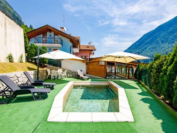 Val di Sole: Small, comfortable residence "Al Pescatore", 3 storeys, surrounded by trees and fields. 15 apartments in the residence. In the hamlet Tozzaga 4 km from the centre of Caldes, 7 km from the centre of Malè, in a quiet position on a slope. For shared use: garden, swimming pool, indoor pool heated (4 x 10 m, depth 130 cm, seasonal availability: 01.Jun. - 15.Sep. pool opening hours: 10:00-19:00). Terrace, garden furniture. In the complex: restaurant, bar, WiFi, sauna, steam room, solarium, hot tub, storage room for skis, central heating system. Stepped path to the house. Parking (limited number of spaces) at the house, communal covered parking (extra) at the house. Shop, restaurant 50 m, bus stop 100 m, railway station "Tozzaga" 500 m, park "Parco Nazionale dello Stelvio" 28 km. Slopes 15 km. Nearby attractions: Folgarida 19 km, Marilleva 25 km, Trento 50 km, Merano 58 km. Well-known lakes can easily be reached: Lago di Garda (Riva Del Garda) 87 km. Please note: the owner lives on the same property. Railway line 100 m from the property. Please note: Trentino Guest Card free for all guests.