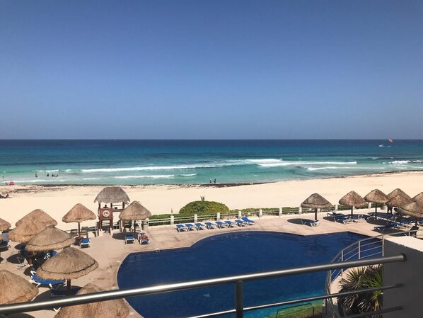 Step into a world of luxury at this 3-bedroom oceanfront villa, where crystal-clear waters and white sandy beaches await. Watch the sunrise from your balcony, then explore nearby jungle tours, sailing, or scuba diving. The fully-equipped kitchen is perfect for entertaining with a marble counter and Mexican bar stools.