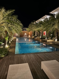 Yes, this property has 2 outdoor pools. Pool access is from 8:00 AM to 8:00 PM.