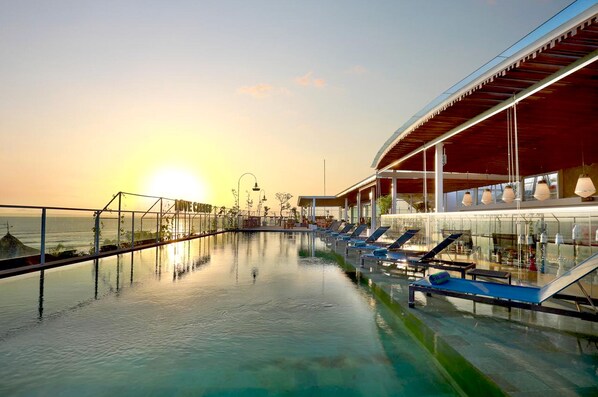Guests can relax poolside or hit the gym before exploring Canggu's premier beaches with the convenient area shuttle service from this central property