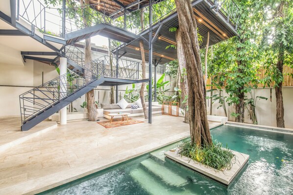 The villa has an open-air living space with a built-in daybed beside a private pool. A garden wall with heliconia plants adds a splash of nature, while ethnic floor rugs bring vibrant color.