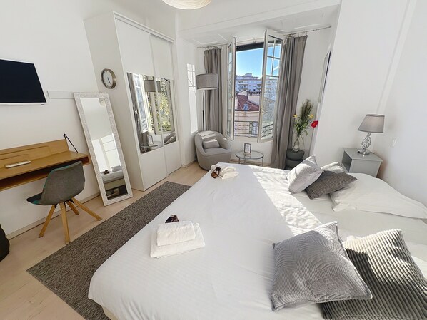 The bedrooms all have storage space (dressing room/closet) and workspace (desk), so that travelers coming to Cannes on business can also pursue their professional activities comfortably from the apartment, thanks in particular to fiber-optic internet access.