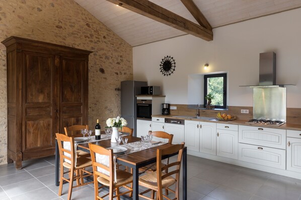The dining room offers a table with 6 chairs and an antique cupboard to hold the crockery.
