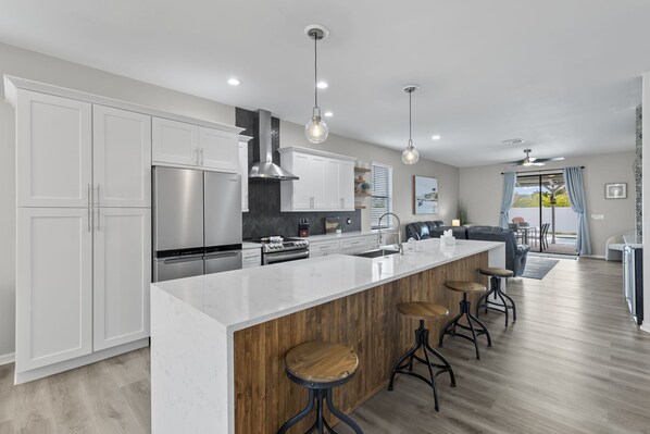 Gourmet Kitchen: The fully stocked kitchen is a chef's delight, equipped with top-of-the-line appliances and accessories. Whip up culinary delights with ease and style and dine at the breakfast bar or in the adjacent dining area.