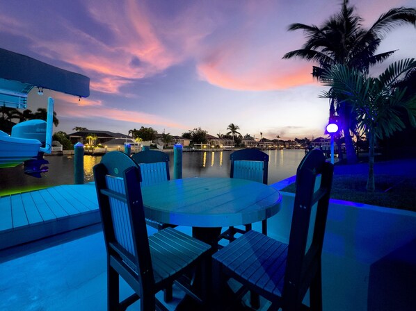 Beyond the screened lanai, the yard invites you for a challenging game of cornhole, easily enjoyed by kids of all ages, great for parites, get-togethers and family holidays! A few steps further, and you have your own private dock, a sun terrace, and yes - 2 kayaks for your enjoyment. Whether you brought your own boat or rent one, the river offers a great escape for fishing adventures, wildlife viewing or catching the dolphins at play. If you're an early riser, enjoy a tranquil morning kayak, paddling the canals and watching the word awaken before your eyes. The terrace by the water is also a great place to cast a line right into the canal or work on your tan, and an evening sunset never gets old!