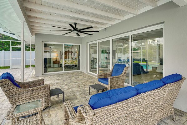 Salt in the air, a drink in your hand, and a seafood feast sizzling on the grill — that’s life at this sun-drenched Cape Coral vacation rental! Perfect for families or groups chasing coastal fun, the 3-bed, 2-bath home features a full kitchen, a cozy living area, and a prime location near beaches, boating, and top sights. After a dolphin cruise at Tarpon Point Marina, fish off the dock or unwind in the pool!