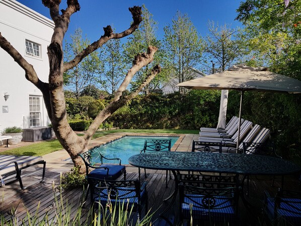 Maison Chablis offers an upscale B&B experience near Franschhoek Wine Tram. Guests love the outdoor pool with shaded umbrellas, free WiFi, laundry facilities, and bicycle rentals for exploring the picturesque wine country.
