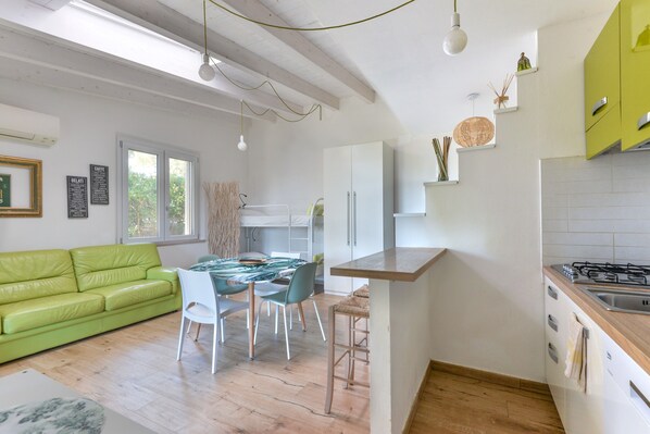 Surrounded by the lush nature of Elba, Villa Sterlizia houses the apartment "Villa Sterlizia-Verde", located not far from the village of Lacona. The modern studio, recently renovated, features a living area, a well-equipped kitchen with dishwasher, a bathroom, and can accommodate up to 4 people. Additional amenities include Wi-Fi (suitable for video calls), air conditioning, satellite TV, and a washing machine. The accommodation is also suitable for children and offers a cot and a high chair.
