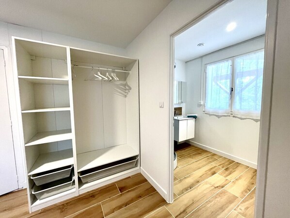 An independent bathroom with a shower and washbasin completes the set, as well as separate toilets. A utility room equipped with a washing machine is also available.