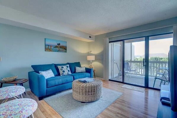 The cozy living room of this unit is open to the kitchen, making the space feel larger than it is. The kitchen is stocked with the essentials you'd need to enjoy a home cooked meal during your stay, and there is seating for up to 4 people at the barstools by the peninsula. The bedroom has a queen size bed, and there is a sleeper sofa in the living room for additional guests. Start your morning off on the covered balcony to enjoy the fresh, sea air!