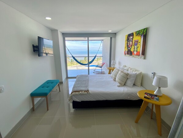 This well-appointed condo features 2 ocean-view bedrooms, gorgeous living/dining area, 2.5 bathrooms, fully-equipped kitchen, generous balcony and can comfortably accommodate up to 6 people. The master bedroom has a queen bed with full bathroom and Smart TV. The second bedroom has two full beds, which can be placed together a as a king bed, and a second full bathroom. The bright living room is fully furnished and includes a futon couch, which converts into a bed and Smart TV. The kitchen is well-equipped with pots, pans, dishes, cutlery, cups, wine glasses, refrigerator, stove, microwave, coffee maker, blender and 6-person dining table. There is a large ocean-facing balcony accessible from the living room and master bedroom, with a hammock and chairs to relax and enjoy the gorgeous views. Here you will enjoy all the comforts of home, including Wi-Fi, A/C, washing machine/clothes dryer and extra sheets, towels and beach towels. The entire condo will be thoroughly sanitized prior to each arrival.