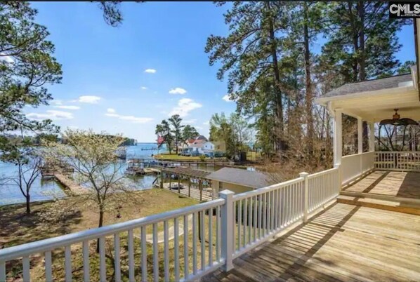 This five bedroom lake home has 2 king bedrooms, one queen, and one full size bedroom. Fifth bedroom has 4 full size beds (bunk). Four of the bedrooms with black out curtains for restful sleep. There are 4 full bathrooms and 1 half bathroom. 2 bathrooms with showers only. 2 bathrooms with showers and tubs. Master bathroom with large walk in shower and claw foot tub that the lake can viewed from. Master bedroom also has direct access to an outdoor balcony with a private loveseat/sofa bed. Due to the constant exposure to weather the sliding glass doors may have a haze or film, they are clean. The fully equipped kitchen makes dinner prep and meals a breeze in the open-concept space where all members of the family can be together. The TV downstairs does not have cable or Roku, so bring your own streaming device or gaming system. No wake zone, panoramic sunrise lake view including Liberty on the Lake at Lake Murray Marina. Deep water off the brand new trex docking with easy swimming and with stair access directly into the water.