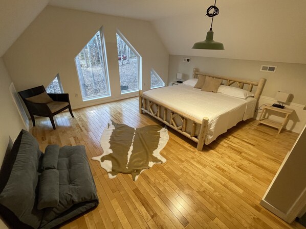 Quiet, unique Lake Norman A Frame home with view of cove and nature from the master bedroom. Central to Mooresville shopping (Harris Teeter, Target, popular restaurants, activities, museums, public boat ramp), Rustic Lane feels like you are miles from nowhere in your cabin by the lake. The home is styled as a wilderness cabin (w/ high speed WiFi). Enjoy a coffee by the fireplace, on the oversized front porch by the lake cove or stay in bed and enjoy the same special view. A destination for relaxation and time in nature.
