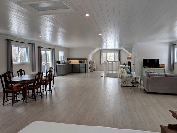 The rental can sleep 4 with one queen bed and one trundle that opens into a queen. A full bathroom is provided. The open-concept kitchen includes a coffee maker, kettle, toaster oven, toaster, microwave and mini-fridge. A private deck offers seating for four and a barbeque. A small selection of board games are available for family fun. The guest suite is also fully heated / air conditioned.