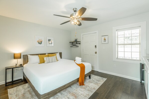 The Finn Room - A PMI Scenic City Vacation Rental offers a mid-century modern feel in Lookout Valley. Enjoy a well-stocked kitchenette, full bathroom, and comfy King bed. Includes WiFi for easy planning to visit Ruby Falls or explore Downtown Chattanooga.