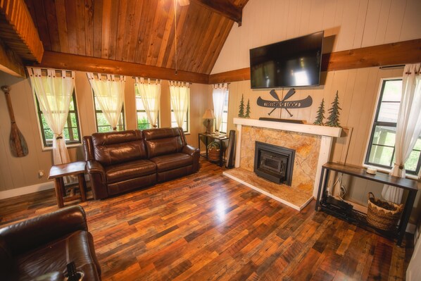 Escape to a secluded private location at Treehouse yet only minutes from downtown Bryson City, Deep Creek National Park, and Cherokee Casino. Relax in the creek-side porch swings with morning coffee or unwind by the fireplace in your living room equipped with new leather electric recliners and fuzzy blankets. The large flat-screen TV offers Dish network cable for entertainment on a rainy day.