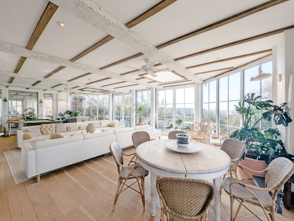 The second sitting room offers stunning sea views with plenty of comfy seating, a large TV, a breakfast area and entertainment options such as a pool table and football table, great for for relaxation and fun.
