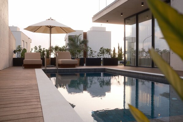 Relax and unwind in our private infinity pool, where you can soak in views of the glistening sea and breathtaking sunsets. Encircling the villa, a well-tended garden creates a peaceful haven for your relaxation.