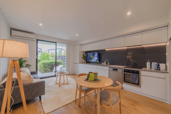A comfortable one bedroom home with a private patio and convenient indoor outdoor access. The space is modern and bright with an open plan living area, smart TV, and a well equipped kitchen. You’ll also have a dedicated parking spot plus a washer and dryer, making it a practical choice for couples, solo travelers, or work stays in Christchurch.