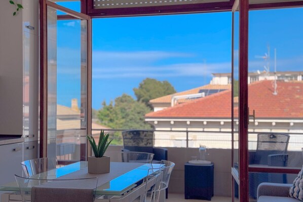 Bright living area with sofa bed, dining table, and large windows opening onto a private balcony with panoramic views of Civitanova.