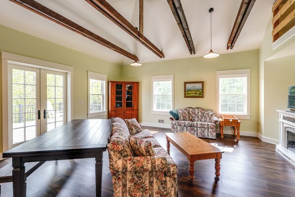 Nestled on the edge of Cuyahoga Valley National Park, Amish Country Guest House offers a serene retreat. Step into the great room with its timbered cathedral ceiling, enjoy a meal at the large dining table, and take in views of rolling pastures and deep ravines from back windows.