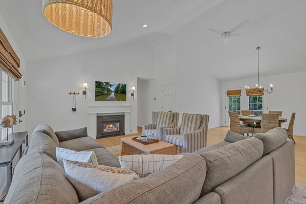 Cove Place features a spacious living room with a fireplace, a fully equipped kitchen, and a screened-in porch with views of the water. There are three bedrooms and two bathrooms, and can comfortably sleep up to 7 guests.