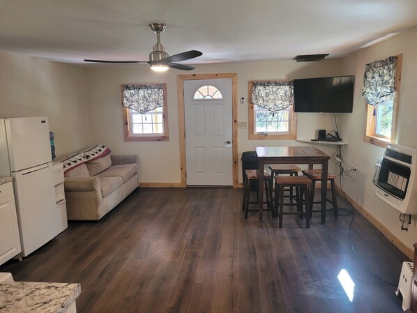 Consider this cabin your home away from home while you visit Stewartstown. This adorable property offers a cozy one room cabin, with a nice sofa bed for extra guests and full kitchen. Direct Snowmobile and ATV Trail access. Enjoy the soothing atmosphere with WiFi, AC, and heating available. This cabin comes with all the amenities of home including, cookware, dinnerware, glasses, utensils, coffee pot, coffee, sugar, creamer, toaster oven, shampoo, conditioner, soap, towels, linens, TV, DVR. BBQ (gas provided) and firepit This cabin is perfect for a small family looking for a relaxing getaway. We think our place will help you experience everything the North Country has to offer. Also offers full access to near by Ladd Pond Cabins and Campground with hiking trails, paddleboats, kayaks, Jon boats, swimming and fishing (no license required). No charge for amenities.