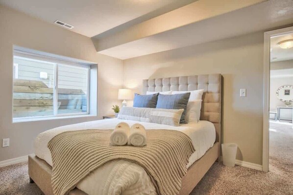 Enjoy a restful night’s sleep in the bedroom, featuring a comfortable queen bed and a Smart TV for relaxation. Fresh linens are provided for your comfort throughout your stay.