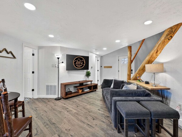 The Main Level: The heart of the home features a cozy living room equipped with a plush sofa and an HD Roku TV, perfect for streaming your favorite shows after a day of exploring. The fully equipped kitchen has everything you need to whip up meals, including a mini-stove, microwave, fridge, cookware, and utensils.