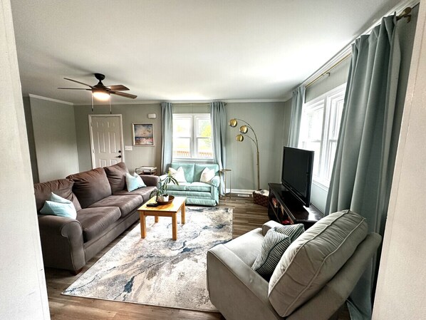 FRONT LIVING ROOM: The living room is spacious and welcomes you in with it`s large picture window & natural light and comfortable seating with 2 swivel rocking chairs! Our bookshelf has plenty of books & games.