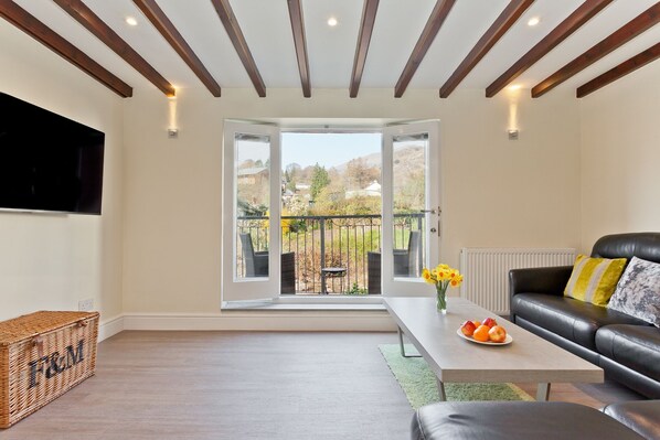 Forge Bridge Cottage offers the perfect retreat for families and friends, boasting an open plan living area with French doors leading to a decked veranda overlooking Coniston fells. Enjoy mountain views from the Juliet balcony in Bedroom 2, relax in the stylish house bathroom with underfloor heating or unwind on shared patio areas.