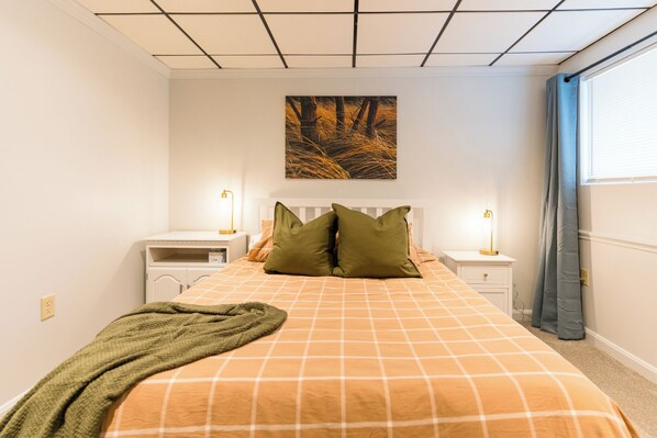 This two bedroom unit features an open floor plan, tons of space to relax and hang out, granite countertops and stainless steel appliances, smart tv, huge covered deck, central heating and air conditioning, queen beds, and personal touches with photographic canvases of local scenes taken by the owner, and pottery from local potter Frank Stofan. There is plenty of off-street parking - enough for multiple vehicles, a boat, or trailer. Come enjoy your home away from home! *Off Street parking *Queen beds *Kitchen with pots, pans, utensils *Open living area *Family games *Pack and play available upon request *Grassy yard for walking dogs