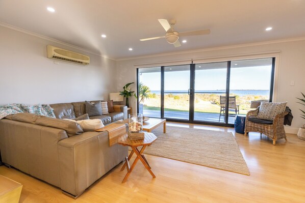 We offer a beautiful beachfront 3 bedroom holiday house where you can sit back and enjoy the magnificent views of Coobowie Bay to the lights of Edithburgh and Wind Farm. There is no road between you and the beach, just step off the front verandah to the lawn leading onto the sand. Internet provision is included, no big downloads please, (bring your Netflix and Stan account details ). House is tastefully decorated and includes modern and quality features. The master bedroom has an ensuite and sliding door to front deck. Bedroom 2 also has sliding door to front deck. Lay back in bed and have that first cup of tea staring at the ocean views and weather of the day. Grass lawns to the front for kids to play.
